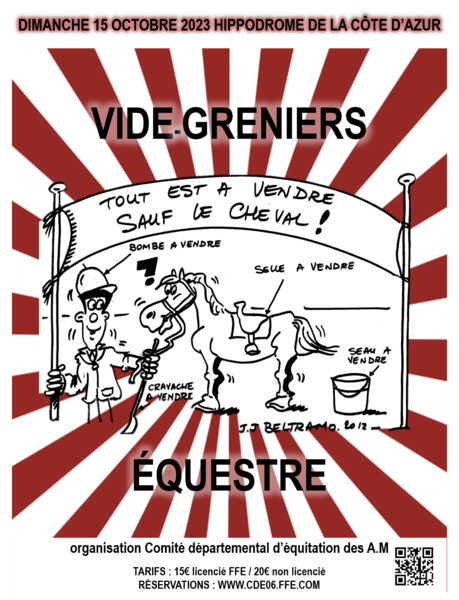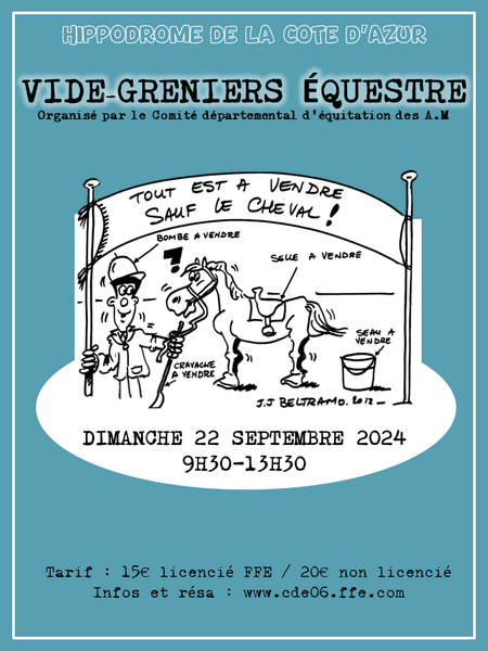 Le comité départemental d'équitation des Alpes-Maritimes organise le dimanche 15 octobre prochain sur l'hippodrome de la Côte d'Azur de Cagnes sur Mer son 3ème VIDE GRENIER ÉQUESTRE.