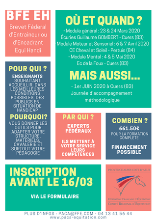 La commission Formation et Equi Handi du Comité Régional d'Equitation Sud vous proposent une formation au BFE EH (Brevet Fédéral d'Encadrement Equi Handi)